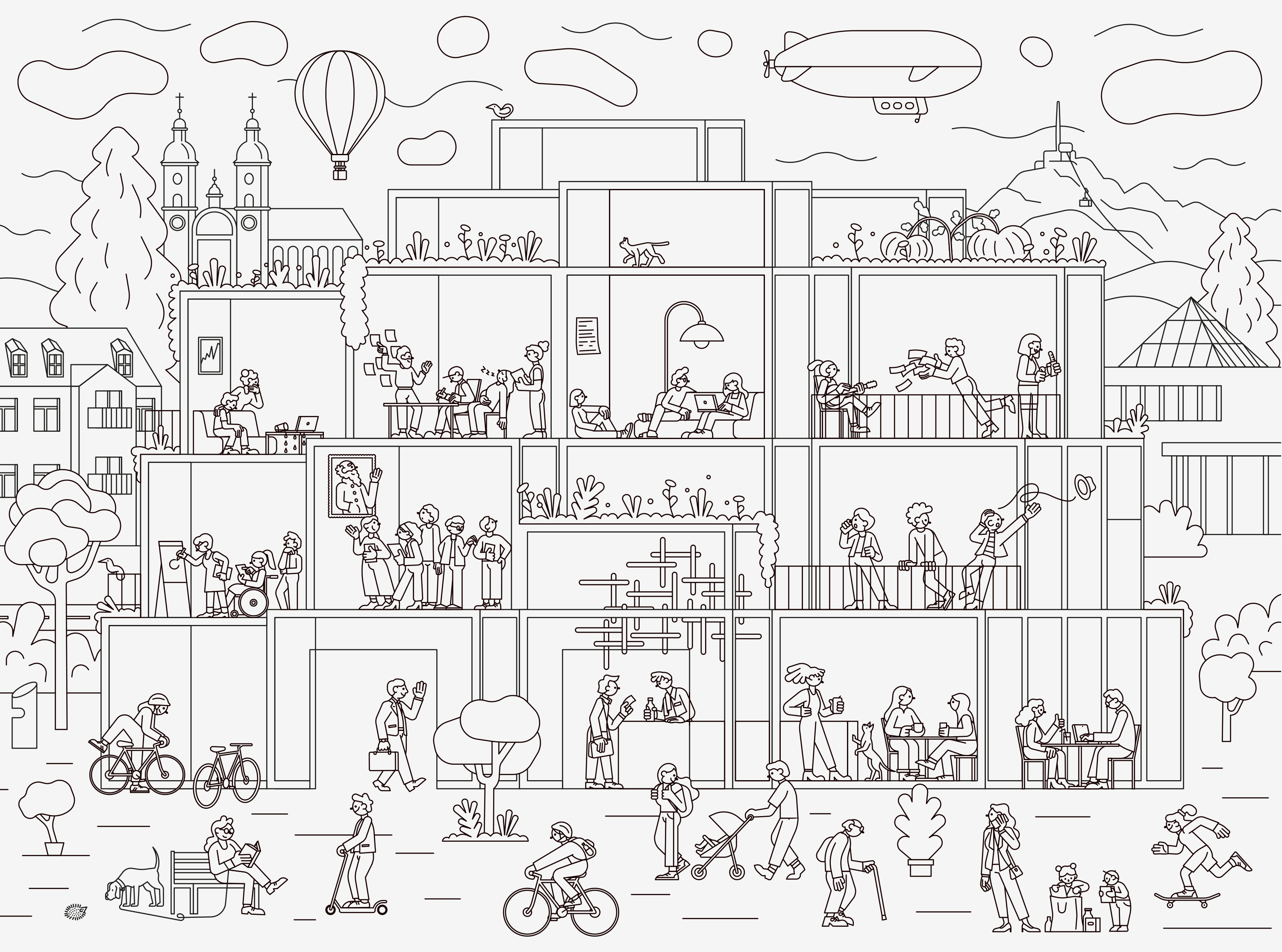 Ausmalbilder für das neue Gebäude der Universität St. Gallen mit Innen- und Aussenansicht. In Zusammenarbeit mit Zéa Schaad .